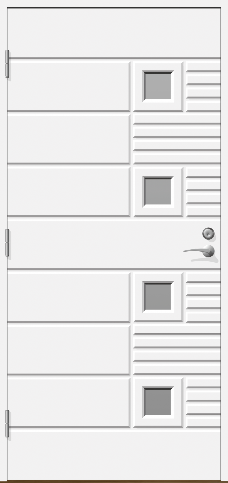 Handtag och nyckelhål, även seriekopplade Säkerhetslås Förberedelse och rördragning för elektrisk låsning Dörröga, ringklocka, brevinkast Över- och sidofönster Sparkplåt i rostfritt stål eller aluminium Fast eller öppningsbar sidodel som passar dörrens stil